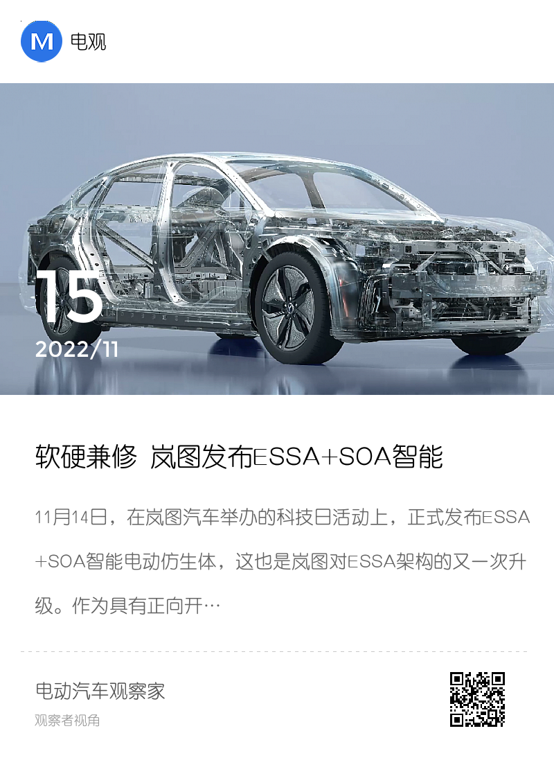 11月14日,在岚图汽车举办的科技日活动上,正式发布ESSA+SOA智能电动仿生体,这也是岚图对ESSA架构的又一次升级。作为具有正向开发、软硬兼修、行业领先、极致表现的ESSA+SOA智能电动仿生体,为用户提供领先可靠的智慧电动汽车解决方案。岚图追光作为首款搭载ESSA+SOA智能电动仿生体的车型,将于12月首发亮相。